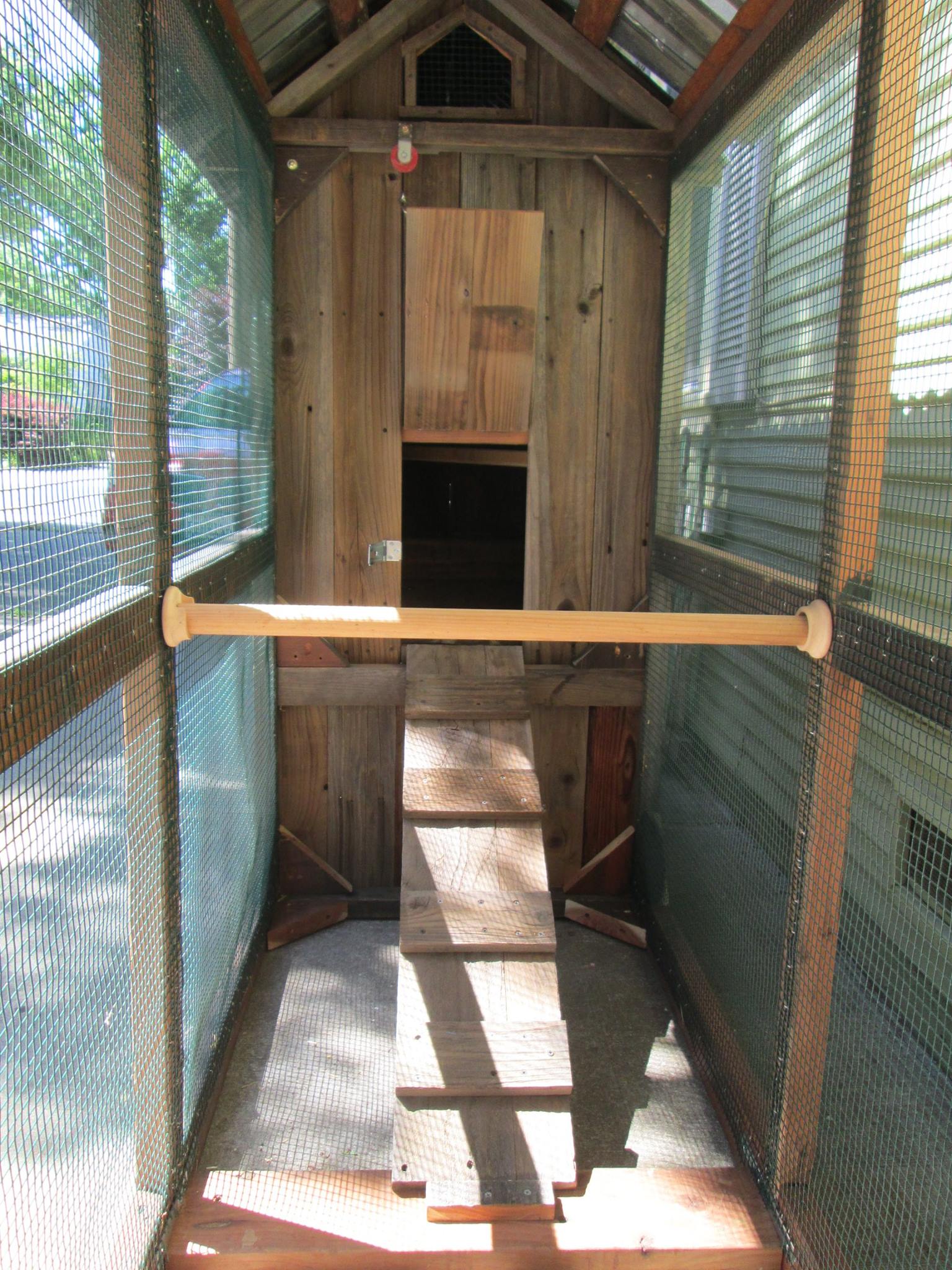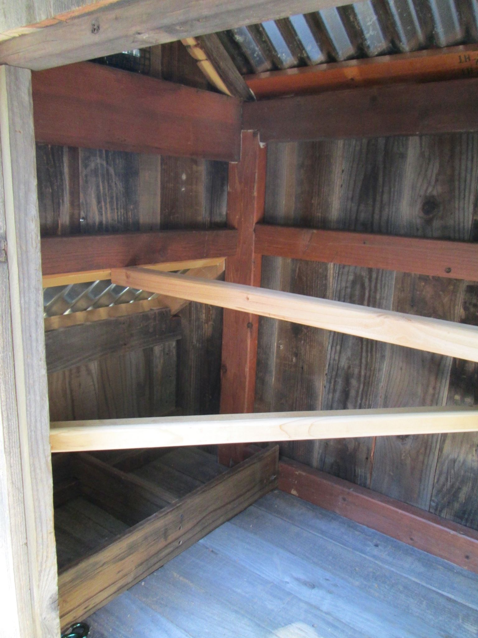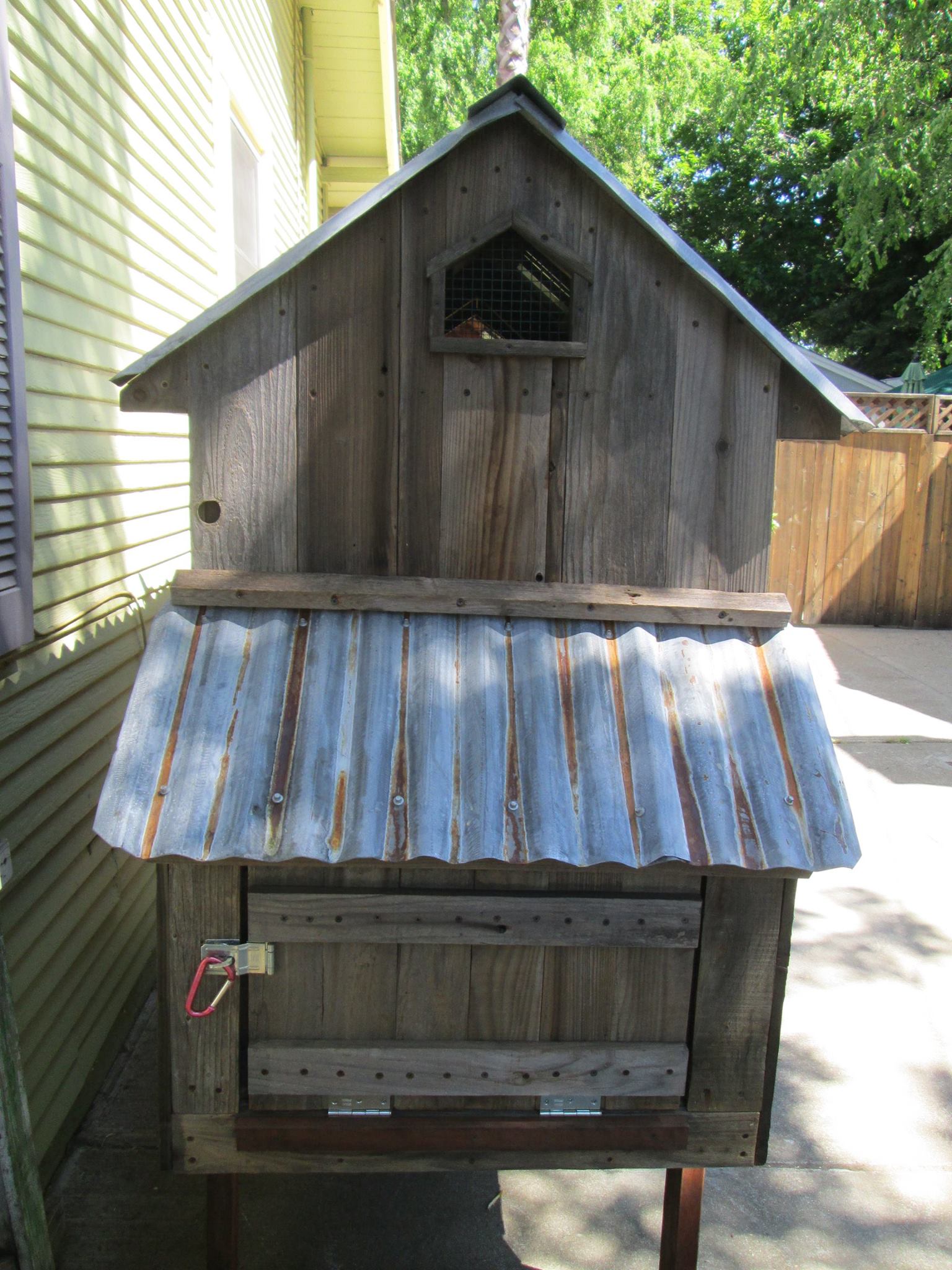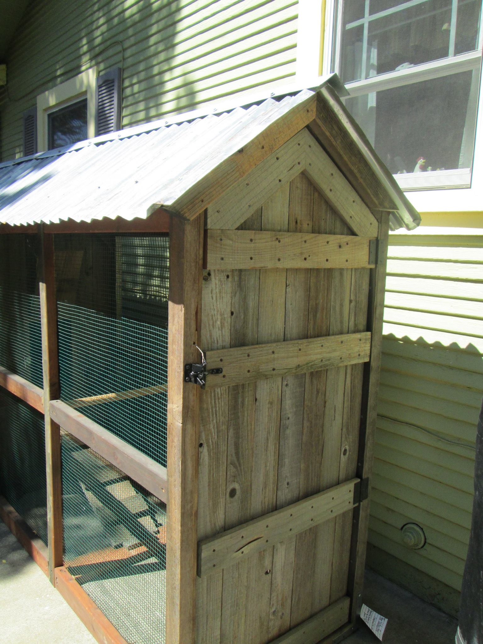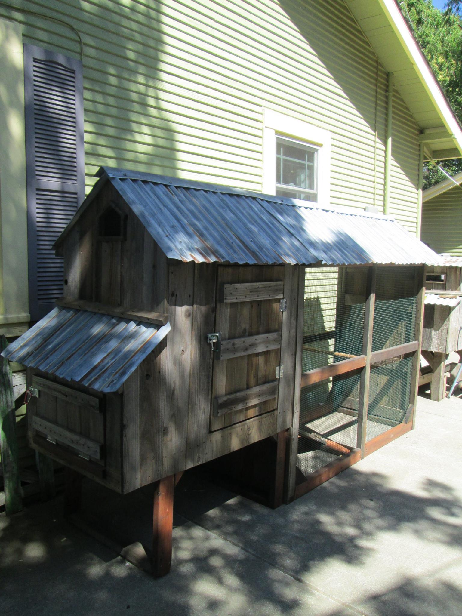Coop and run with reclaimed wood and aged metal roofing (coop and run a little over ten feet in length)
