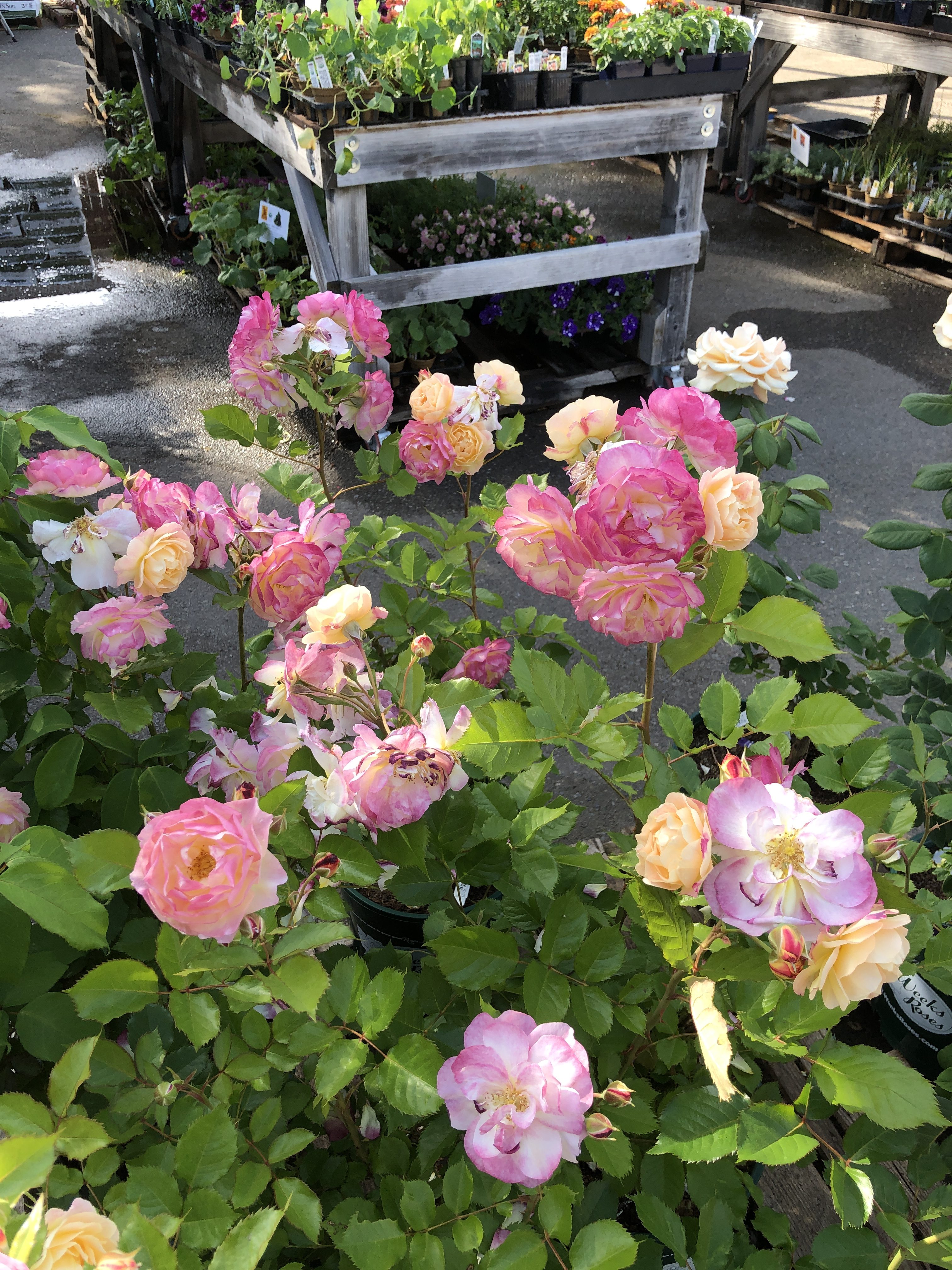Roses arrive in January from Weeks Roses, when they are completely dormant, with only picture tags and Google to tell you what the rose looks or smells like. We pot up our roses immediately upon arrival, because we know most customers prefer to select their roses when they’re in bloom. Now’s the time to enjoy roses blooming all over town, and to select new roses for your garden or as gifts (hint: great Mother’s Day gift!) while we still have them in stock.