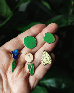 There’s a lot to go crazy for here. A catnip pin? Not one but two Pilea peperomioides pins? A tulip and an iris? OMG… the cuteness is unbearable. All pins are Hard Enamel Cloisonné with a secure Tie Tack Back. The artist Samantha Leung is Seattle based. Wait till you see the cards the individual pins are presented on. So cute! Highly giftable.
