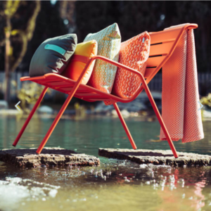 2. Individual or family seating for family groupings or individuals. Combine bistro sets or lounge chairs like this Fermob Monceau Low Armchair with side tables, 6+ feet apart for cozy dining and conversation areas.
